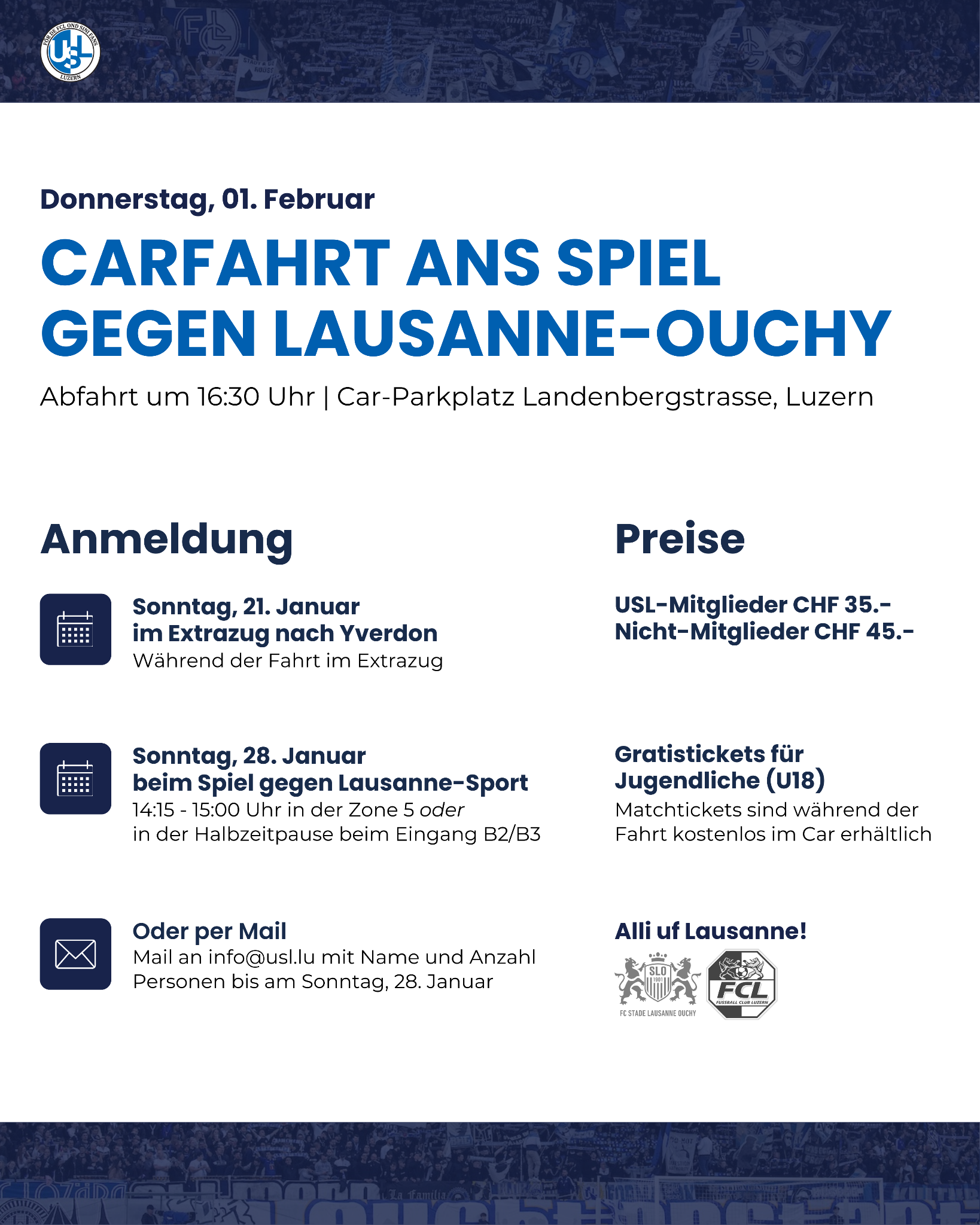 Die Zone 5 öffnet am Sonntag ihre Türen um 10.00 Uhr und bietet ein Mittagessen an. Letzter Treffpunkt am Bundesplatz ist der USL-Stamm um 12.00 Uhr.