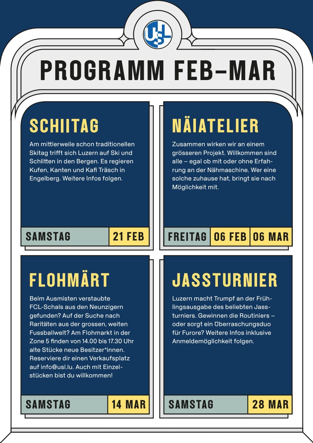 Als Dankeschön für die Unterstützung wird allen USL-Mitgliedern ein Kalender für 2026 geschenkt. Dieser kann gegen das Vorweisen der Mitgliedskarte wie folgt bezogen werden: